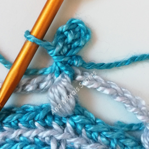 Toer 16: (kleur A) Begin met een staande v om zowel de 6l-b van toer 14 als de 8l-b van toer 15. 9 v om dezelfde 6l-b en 8l-b. *1 l. Sla de Rvv met picot over. Duw de picot naar de voorkant en haak 10 v om de volgende 6l-b en 8l-b.** Herhaal van * tot ** waarbij je de laatste 10 v weglaat. Hv in de 1e v. Knip de draad door en hecht af. Hoewel de volgende toer in dezelfde kleur wordt gehaakt, geef ik er toch de voorkeur aan de draad door the knippen om verdikkingen te voorkomen.Β [200 v, 20 1l-b]