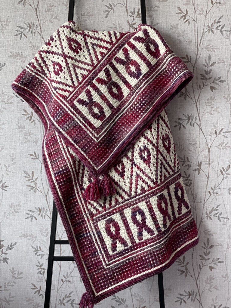 My blanket ended up with a final size of 103 cm x 135 cm (40.5” x 53”), approximately. You can customize the size of your blanket by adding or decreasing repeats of the pattern, but keep in mind that this will affect the amount of yarn required.