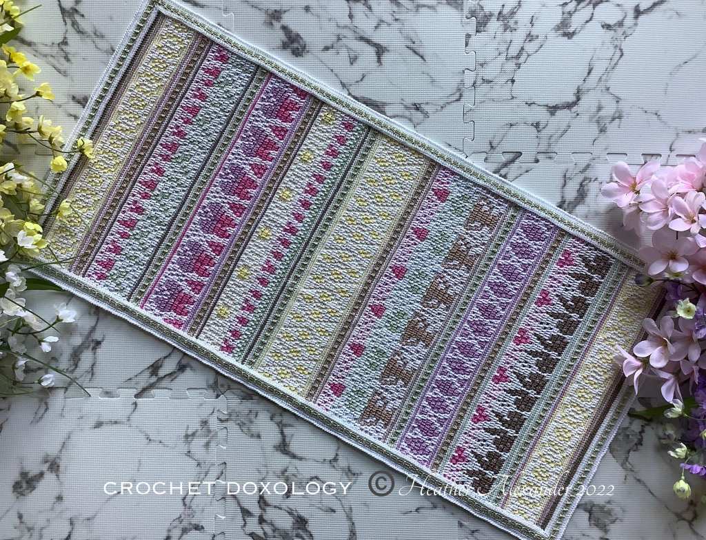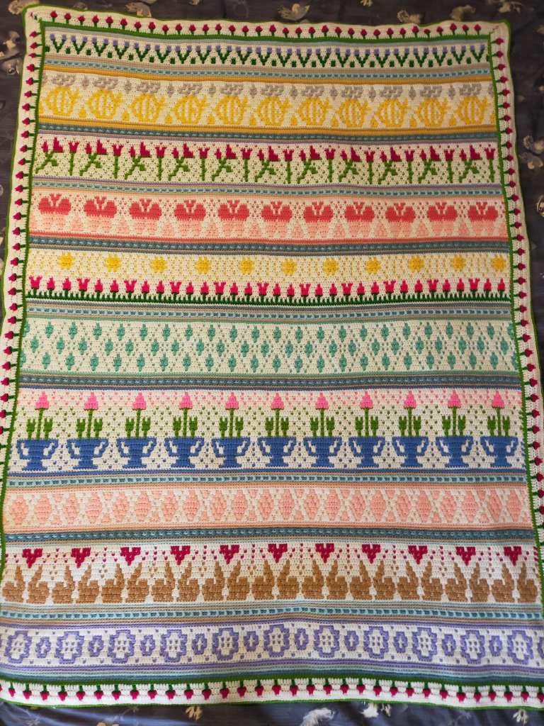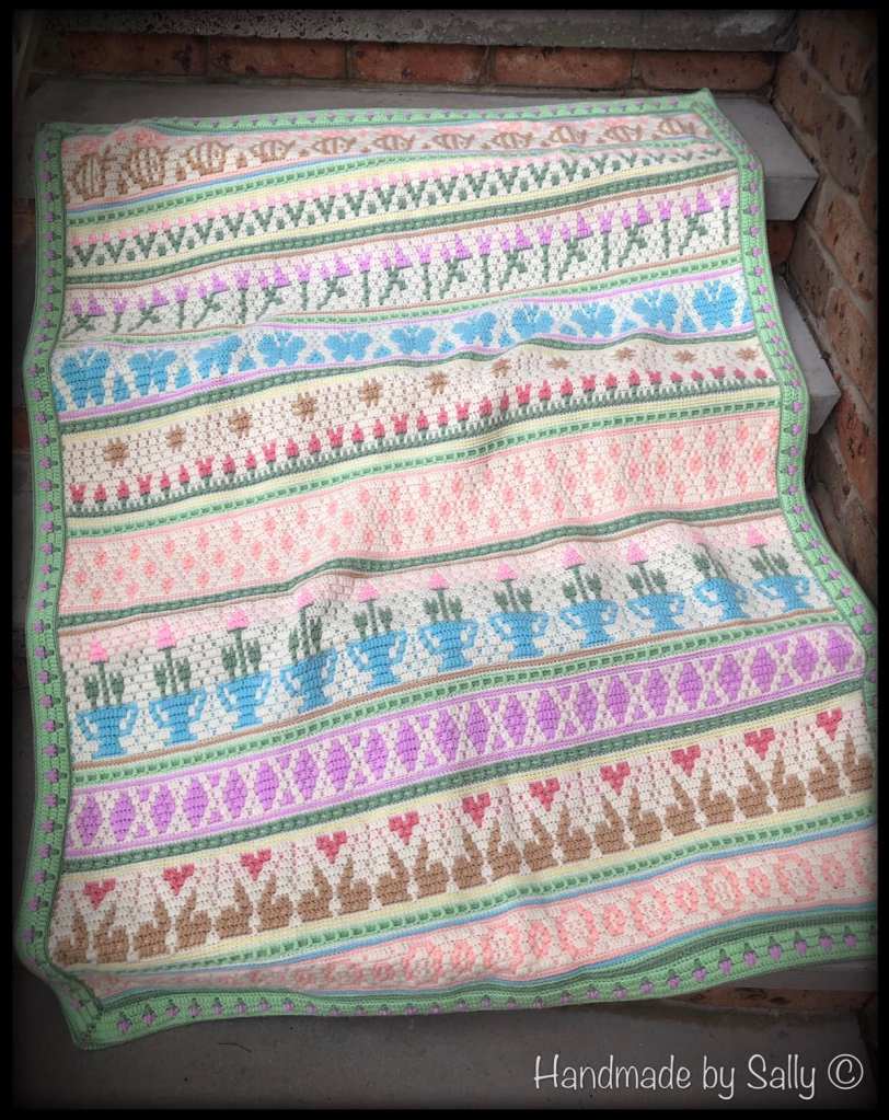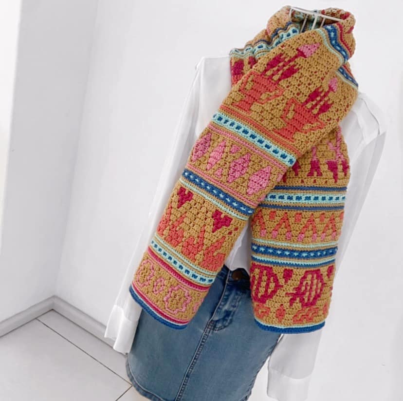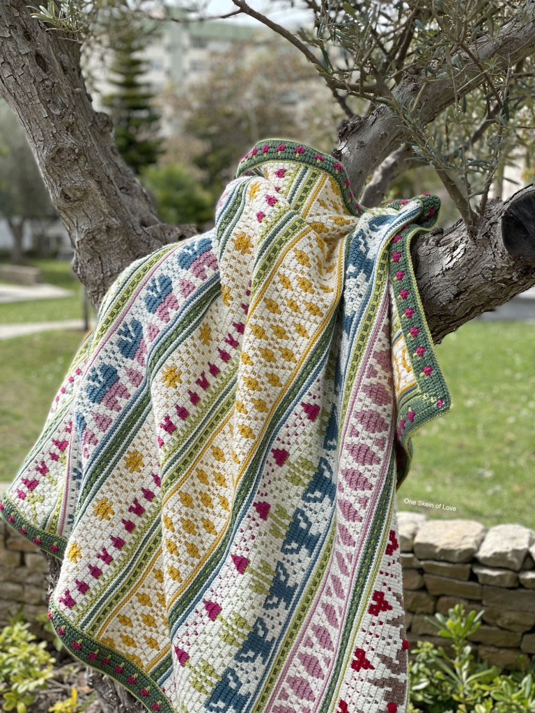Hello Spring is a pattern for a blanket using overlay mosaic crochet technique. It is great to use your yarn stash. In my FB Crochet group – Oneskeinoflove Crochet – you can find so many different colour versions of the blanket. Some crocheters also used the pattern to create table runners, cushions and even a scarf.