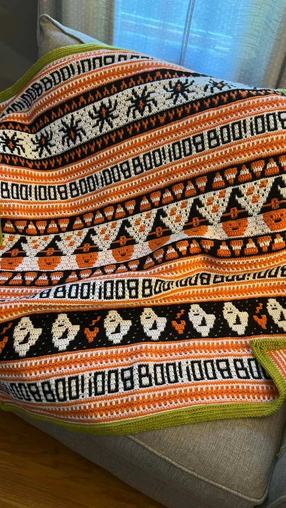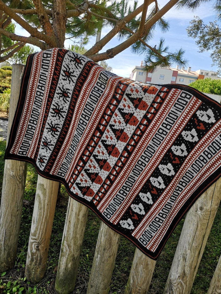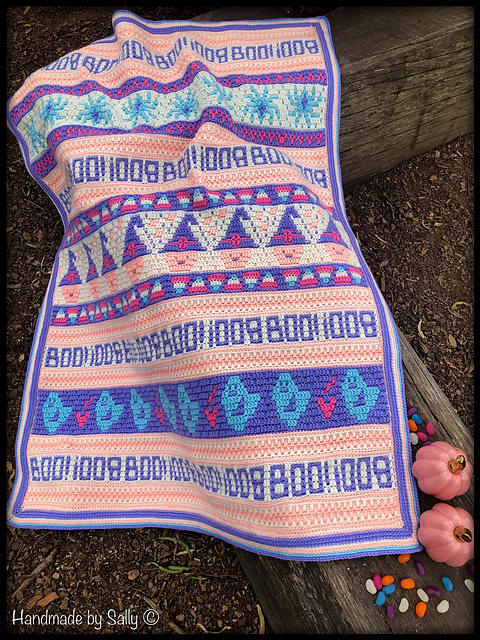 BOO!!!Licious is a cute pattern for kids and grow ups too and also a very elegant and relaxing one to do. It uses overlay mosaic crochet and mosaic tapestry techniques. If you are an adventurous crocheter and a patience one you will be fine with the tapestry parts. If you prefer you can do your blanket using only the regular mosaic crochet technique.