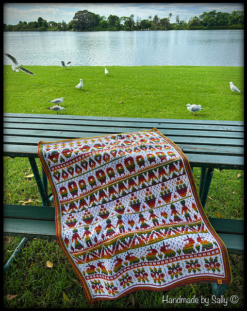 Pattern is written in English (US Terms). It has a Spanish, German and Dutch translation, and a left-handed version too. It has step-by-step written instructions, a mosaic tutorial and a border tutorial with photos for every row and steps, charts, and lots of pictures to guide you through all the CAL parts.