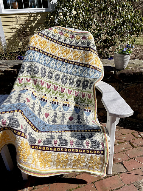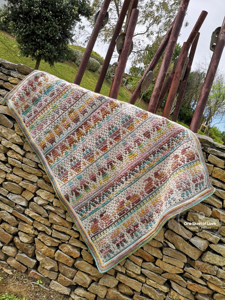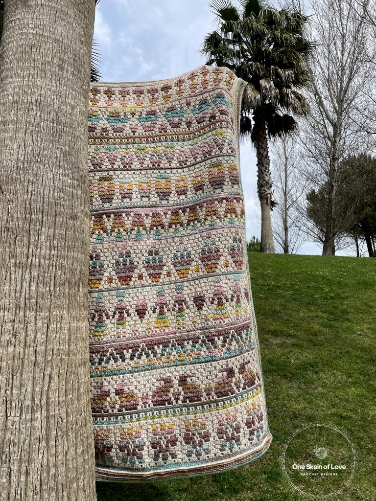 The blanket is divided into 6 parts. The first 5 parts will create the blanket body. The last part will be dedicated to the border. There are 11 different patterns distributed in the first 5 parts of the CAL. You can play with the patterns or repeats to create a bigger or smaller blankie or to create other house decor itens. You can also add patterns from my Hello Spring design as they use the same stitches repeat.