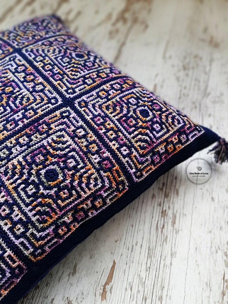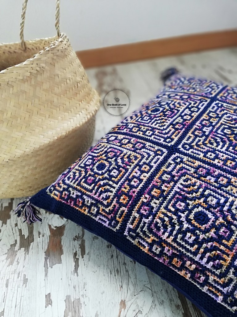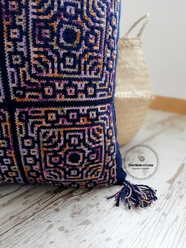 The pattern was created using the overlay mosaic crochet technique. It includes the joining motifs and a border explanations. So it will give you all elements to make a blanket too.