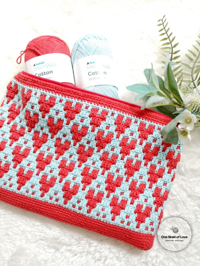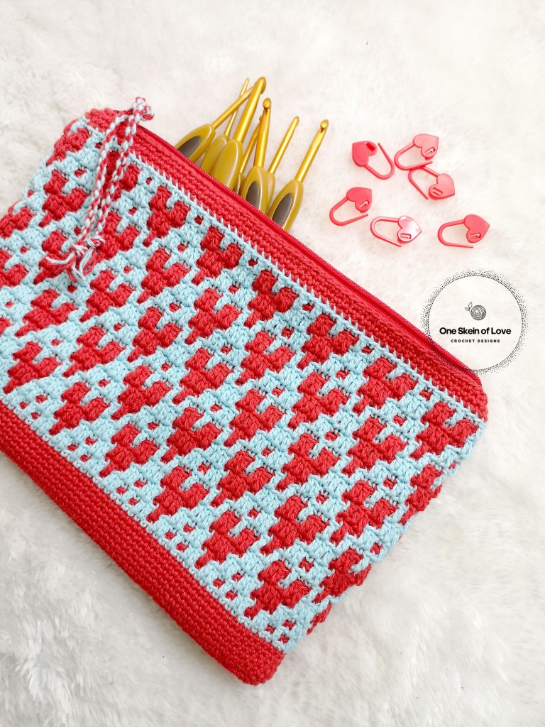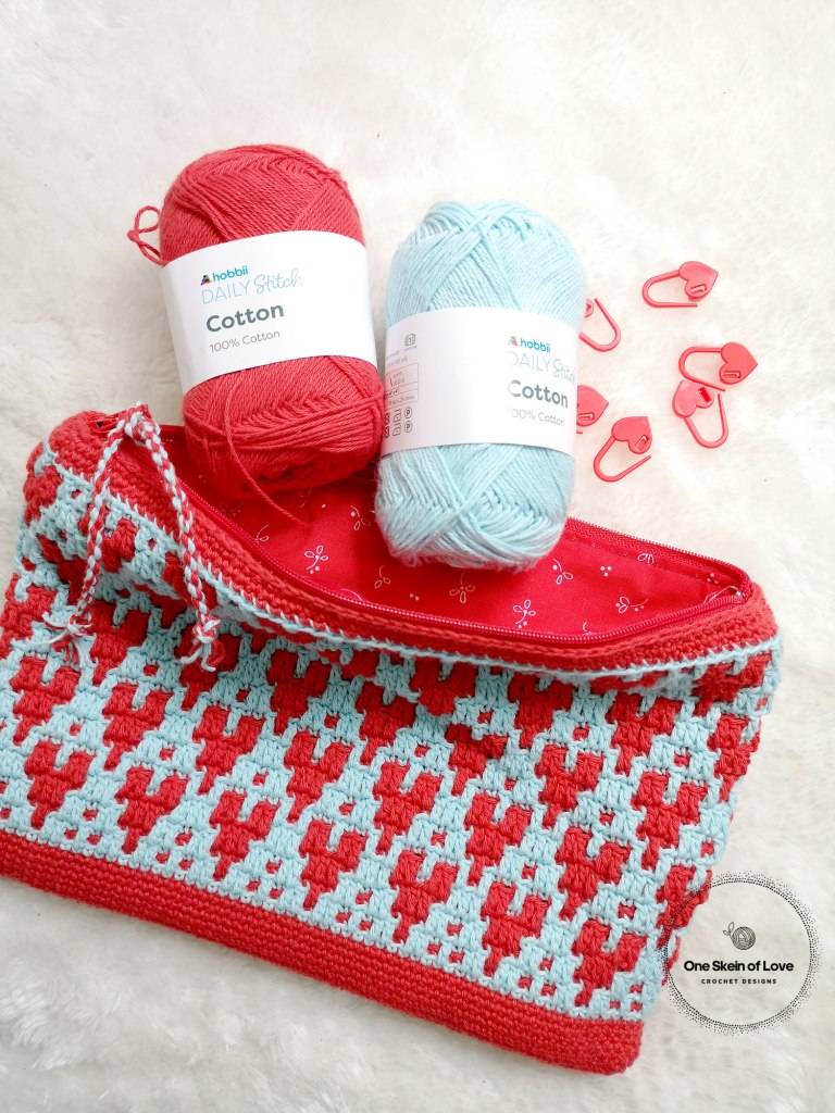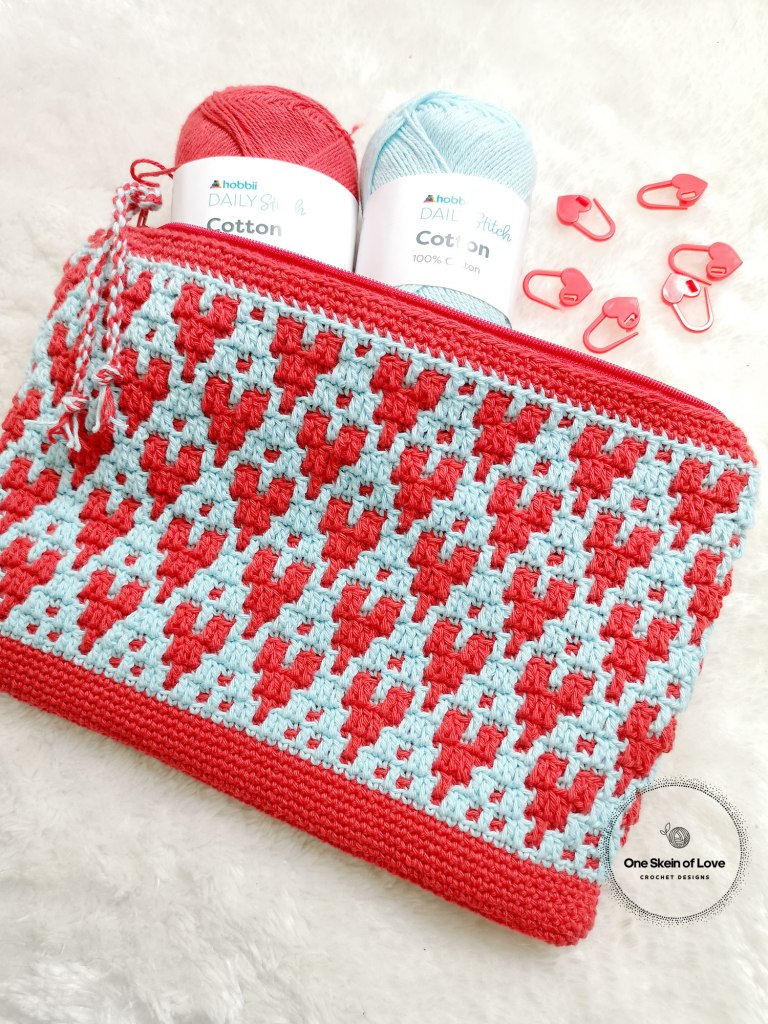 To celebrate LOVE I came up with «Love is in the Air» pattern. This is a quick pouch pattern great to use those single balls of yarn. The pattern is great to carry small wips or to keep your hooks and needles safe.