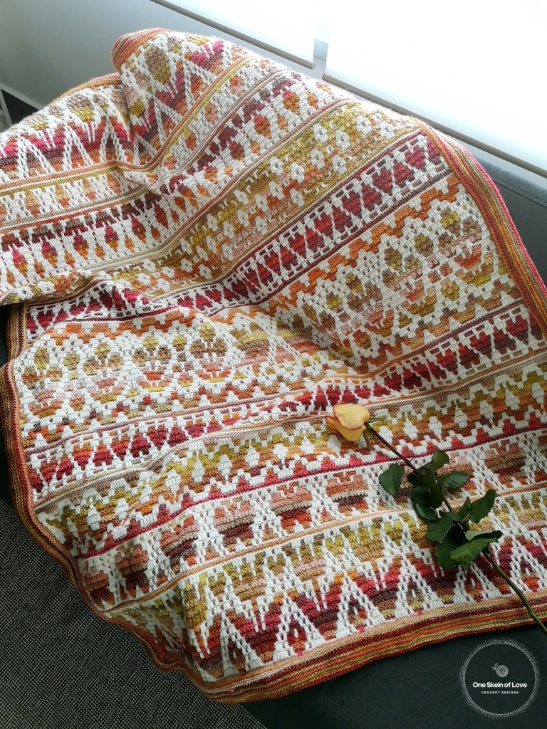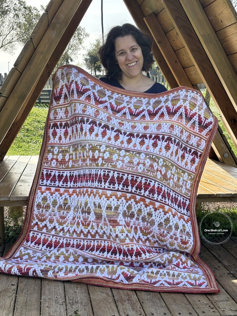 The final size of the blanket is 105 cm x 137 cm (41” x 54”), approximately. You can customize the size of your blanket by adding or decreasing repeats of the pattern, but keep in mind that this will affect the amount of yarn required.